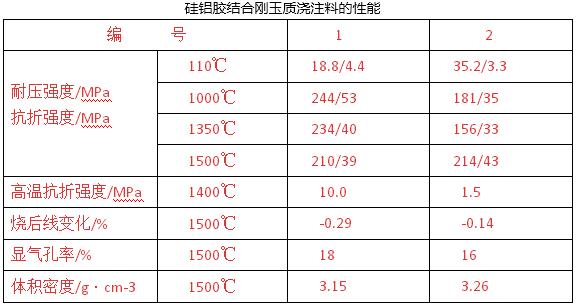 (下表)為硅鋁膠結合劑剛玉質澆注料的性能。電熔剛玉骨料的顆粒組成(%):7~2.5mm 26%, 2.5~1mm 33%: 1~0.5mm 18%和 <0.5mm 23%。其用量為81.5%:α—AL2O3細粉的細度小于0.076mm ,其用量:編號1和編號2分別為6.0%和13.5%。固態硅鋁膠用量則分別為12.5%和5.0%。水用量為4.3%。