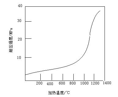 黏土耐火澆注料在加熱過程中,發生一系列的物理化學變化。這些微觀上的變化,在宏觀上就是其強度變化特征(見下圖)從圖中看出,隨著加熱溫度的不斷升高,其耐壓強度也增大,特別是在800~1000℃時,強度由10MPa左右驟然增到31MPa以上,隨后強度增大較少。