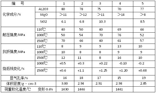 超微粉結合鋁鎂尖晶石質耐火澆注料用的耐火骨料,主要是山西特級礬土熟料,AL2O3與TiO2合量約為90%,臨界粒徑約為25mm,一般采用連續顆粒級配,也有用間斷級配的:結合劑為活性SiO2超微粉,SiO2大于91%,中直徑D5O約為3μm,另加聚磷酸鈉等分散劑和快干劑。其性能見(下表);|中均加較高檔次的鋁鎂尖晶石粉、剛玉粉和α-AL2O3超微粉。表中編號1添加電熔鎂砂粉,用量約為9%:編號2添加高純鎂砂粉,編號4添加MgO約為94%的燒結鎂砂粉,編號3、編號5和編號6則為中檔鎂砂粉。其細度均不大于0.088mm。