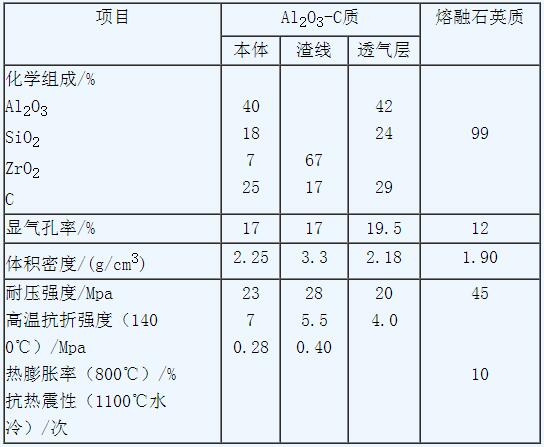浸入式水口的材質(zhì)常用的為熔融石英質(zhì)及鋁碳質(zhì)。熔融石英質(zhì)水口由于耐侵蝕性較差,不適應(yīng)多爐連鑄及連鑄鋼種擴(kuò)大的要求,兩種浸入式水口的性能比較見表2。20世紀(jì)90年代以來采用鋁碳質(zhì)、鋁碳-鋯碳質(zhì)復(fù)合式水口,日本還開發(fā)了在鋁碳質(zhì)材料的基礎(chǔ)上添加ACT,AZTS合成原料的浸入式水口和以ZrO2-C補(bǔ)強(qiáng)的復(fù)合式水口。