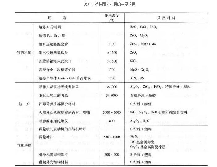 氮化鋁特種耐火材料。由于氮化鋁是很好的耐侵蝕材料,可做熔煉金屬的坩堝、脫模劑、保護(hù)管。在煉鋁工業(yè)中做鋁真空蒸鍍用的容器。高純度氮化鋁可做煉砷化鎵和磷化鎵等半導(dǎo)體的容器。各種特種耐火材料在各領(lǐng)域的應(yīng)用見表1-1。
