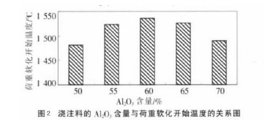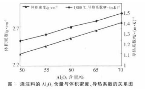 以特級(jí)、二級(jí)及三級(jí)高鋁熟料及焦寶石為主要材料,加入硅微粉,以鋁酸鈣水泥為結(jié)合劑,以磷酸鹽為減水劑。固定硅微粉、水泥及磷酸鹽減水劑的加入量,測(cè)試澆注料的不同氧化鋁含量與荷重軟化開始溫度、體積密度、導(dǎo)熱系數(shù)的關(guān)系。(見下圖1)由下圖可知,隨著低水泥澆注料氧化鋁含量的提高,澆注料的體積密度增大,導(dǎo)熱系數(shù)提高。(由圖2)可知,低水泥澆注料的氧化鋁含量在60%左右時(shí)澆注料的荷重軟化開始溫度較高,可選擇在軋鋼加熱爐高溫段使用,從性價(jià)比來(lái)考慮,氧化鋁含量在50%的澆注料可選擇在軋鋼加熱爐的低溫段使用可達(dá)到有效的節(jié)能目的。