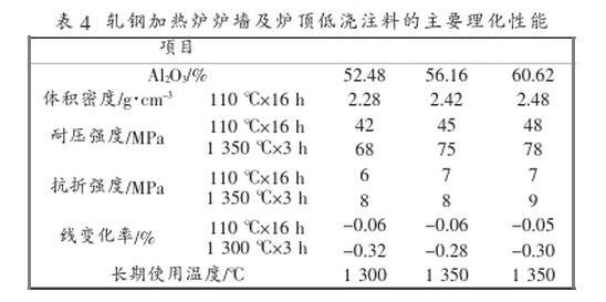 軋鋼加熱爐的預(yù)熱段工作溫度一般在1200℃以下,采用氧化鋁含量為50%~55%左右的低水泥澆注料完全可滿足使用需求。加熱段及均熱段工作溫度一般在1350℃左右,可選擇氧化鋁含量為60%左右的低水泥澆注料,該澆注料細(xì)粉應(yīng)選擇雜質(zhì)含量較低的原材料,以提高澆注料的高溫使用性能。爐墻及爐頂澆注料主要理化指標(biāo)見(下表4)