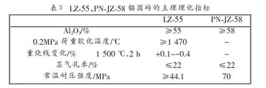 采用不定型耐火澆注料作為工作襯里的軋鋼加熱爐,錨固磚的選擇較為關(guān)鍵,因?yàn)殄^固磚對(duì)整個(gè)加熱爐襯里的結(jié)構(gòu)起著重要的作用,按照高鋁磚指標(biāo)區(qū)分錨固磚可以分為L(zhǎng)Z-75、LZ-65、LZ-55、LZ-48四種,LZ-75、LZ-65的錨固磚的導(dǎo)熱系數(shù)、熱膨脹率及成本較LZ-55的錨固磚高,在軋鋼加熱爐上一般部位,LZ-55錨固磚完全可滿足使用需要。而在水粱及壓下部位,一般選用振動(dòng)成型的PN-JZ-58的錨固磚。因?yàn)檎駝?dòng)成型的錨固磚臨界粒度較大,材料的結(jié)合強(qiáng)度較高,錨固磚的抗拉強(qiáng)度也較機(jī)壓成型的高,并且通過(guò)國(guó)內(nèi)眾多軋鋼家加熱爐的使用證明(下表3)為L(zhǎng)Z-55、PN-JZ-58錨固磚的主要理化指標(biāo)。