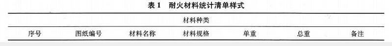 設(shè)計(jì)方在完成熔窯設(shè)計(jì)之后要進(jìn)行材料統(tǒng)計(jì)清單的制作。材料統(tǒng)計(jì)清單直接影響到材料的訂貨、包裝、倉(cāng)儲(chǔ)以及出庫(kù),是建設(shè)方用于熔窯材料招標(biāo)和材料供應(yīng)方用于材料生產(chǎn)、包裝的依據(jù)。耐火材料統(tǒng)計(jì)清單樣式應(yīng)當(dāng)包含材料種類(lèi)、圖紙編號(hào)、材料名稱(chēng)、材料規(guī)格、單重、總重等類(lèi)別(如表1),這樣的清單能夠較為方便地讓建設(shè)方、材料供應(yīng)方、施工方根據(jù)圖紙中的尺寸合適材料的規(guī)格、單重、總重是否正確。