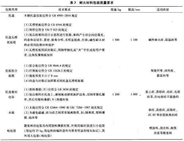 建設(shè)方與耐火材料供應(yīng)方在訂立合同的時(shí)候除約定材料質(zhì)量、付款方式、交貨日期等事項(xiàng)外,還應(yīng)當(dāng)包含耐火材料包裝質(zhì)量要求(見(jiàn)表3)。合格的包裝質(zhì)量及要求防雨、防潮、防震、防碰撞、防破損、防滲漏等保護(hù)措施,又要滿(mǎn)足堆摞要求、叉車(chē)和吊裝要求等。