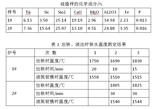 硅鐵包澆注料整體澆筑在很多的硅鐵廠任然還是空白。為此需要研制一種能滿足硅鐵包襯的耐火澆注料。首先取硅渣樣進行分析判斷其酸堿性,分析結果見表1,并對鐵水溫度進行了檢測,測定結果見表2.