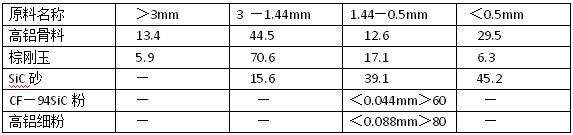 根據鐵水溝對耐火材料的要求,高鋁碳化硅磚應具有良好的熱震穩定性、抗鐵水沖砂及耐侵蝕性。約80%以上的磚單重都超過50Kg,故此應適當擴大顆粒的極限尺寸。這對磚的熱穩定性,耐沖砂和抗侵蝕性都是有益的。配料的顆粒極限尺寸為4mm,各種原料的顆粒組成見下表: