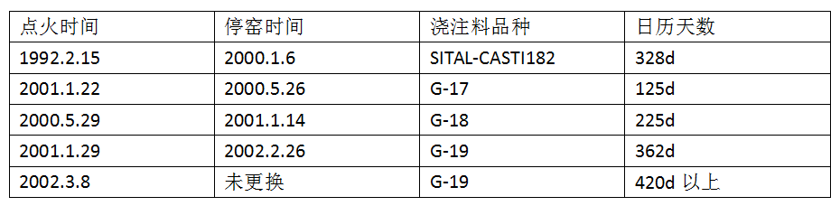 為使回轉窯窯襯達到1年的齡期,近年來選用了G-19剛玉碳化硅澆注料,與G-18剛玉鋼纖維澆注料進行常識性對比,進過一年的使用對比G-19的性能優于G-18。