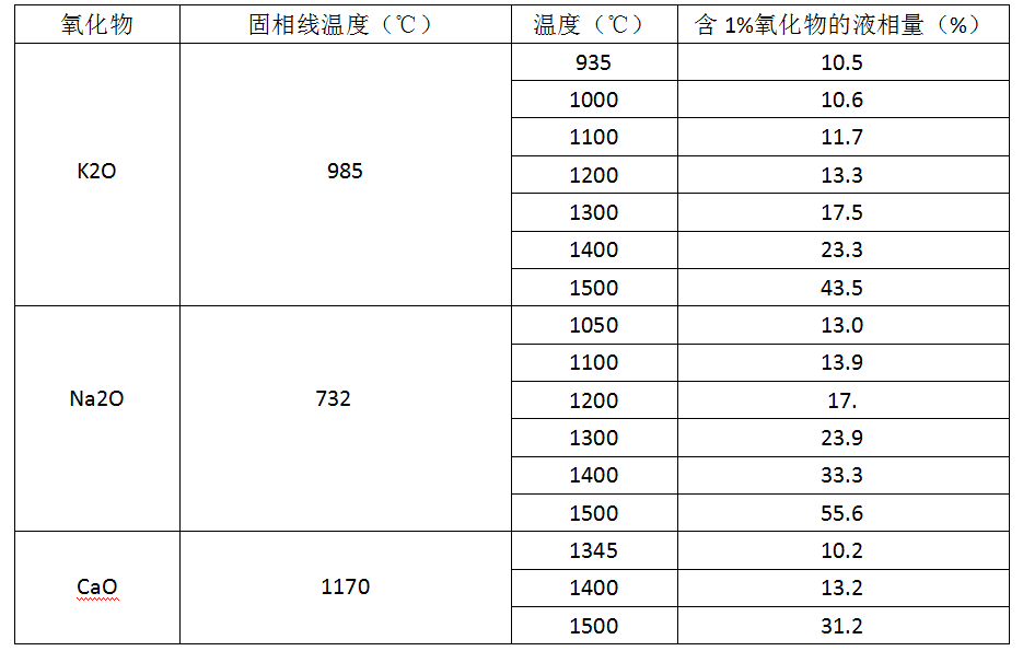 剛玉澆注料一般都為低水泥型,主要成分為Al2O3和SiO2。其中Al2O3含量大于90%,SiO2含量大約在3%~4%左右,還含有少量的CaO等。堿金屬是以游離的K2O、Na2O以及K2SO4、Na2SO4的形式侵入耐火材料,其影響程度使十分嚴重的。