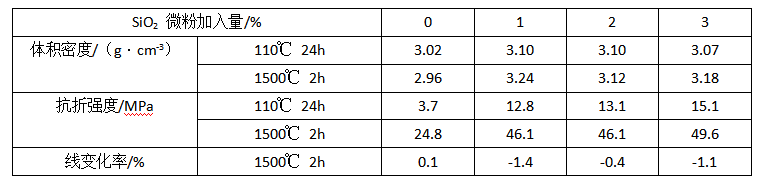 表1 SiO2微粉添加置對(duì)澆注料性能的影響