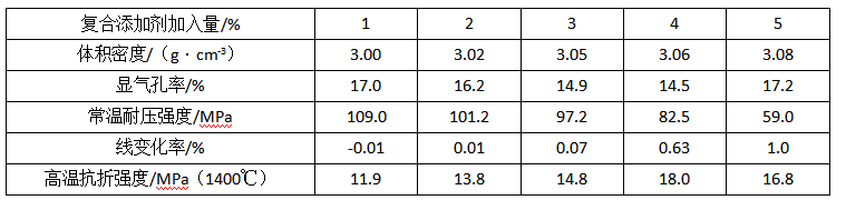表2 復(fù)合添加劑對(duì)1500℃ 3h燒后澆注料性能的影響
