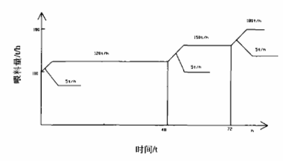 (2)第一次掛窯皮起始喂料量控制在設計產量的60%,注意窯速與喂料量匹配。在窯前看燒成帶有一層窯皮便開始逐漸加料,注意保持窯前適當的熱力強度,在生料量加到120t/h時維持穩定,在投料后48h加料至150t/h維持穩定,至72h掛窯皮操作完成,再逐漸加料至設計產量(圖1)。