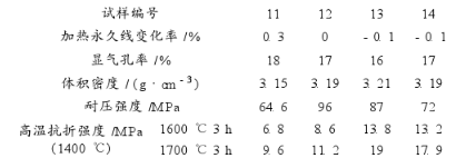 由表5和表6可知,4組試樣在1700℃燒后的高溫抗折強度均明顯高于1600℃燒后的;試樣11沒有添加α -Al203微粉和氧化鉻微粉,加熱永久線變化率為0.3%,其高溫抗折強度最低;同試樣11相比,試樣12添加了3%的氧化鉻微粉,其加熱永久線變化率為0,高溫抗折強度有所增加;試樣13、試樣14降低了尖晶石粉的加入量,同時增加α-Al203微粉,加熱永久線變化率均為-0.1%,燒后的高溫抗折強度有大幅提高,比未添加α-Al203微粉的試樣12還高得多這一組試驗表明,α-Al2O3微粉對高溫抗折強度影響較大。