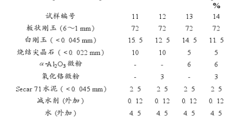采用的原料為板狀剛玉、電熔白剛玉、工業氧化鉻微粉(Cr203含量98.5%)、α-Al203微粉(Dm≈4um)、Secar71水泥和燒結尖晶石粉(Al203含量76%,MgO含量23.5%)。