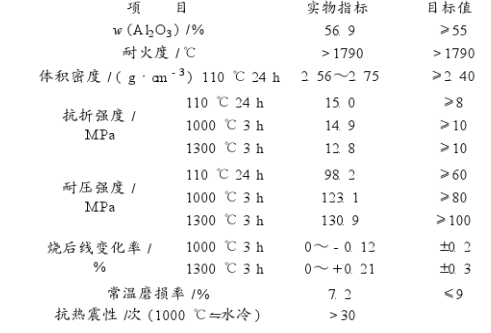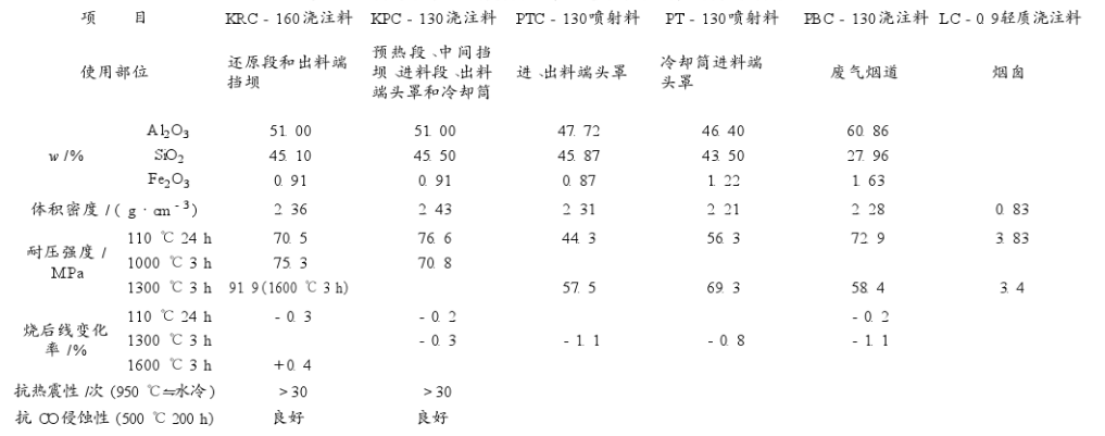 1:直接還原煉鐵回轉(zhuǎn)窯用澆注料的性能: