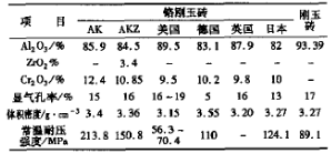 鉻剛玉系列產(chǎn)品所用原料是由氧化鋁和氧化鉻按一定比例配比,經(jīng)過高溫熔化合成的一種固溶體。采用特種耐火材料生產(chǎn)工藝制成耐火磚,可以改善和提高制品的內(nèi)在質(zhì)量,提高制品的高溫性能。我廠開發(fā)生產(chǎn)的部分高性能鉻剛玉磚(AK、AKZ)的理化性能指標(biāo)與國外部分同類產(chǎn)品及剛玉磚的性能比較見表1。