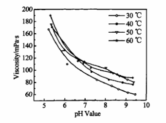 由圖1還可以看出,在pH值相同的條件下,溫度越高,料漿的粘度越大。盡管具體原因有待進一步深入探討,但主要的影響因素可能有: