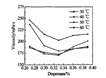 同時可以看出,在堿性條件下(料漿pH=9),30,40℃時分散劑對料漿粘度的影響較大,而50,60℃時分散劑對料漿粘度的影響較小,曲線較為平緩,表明高溫下由于聚合作用的發(fā)生,分散劑的作用明顯減小。