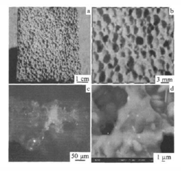 取球料比為4:1的樣品進行結(jié)構(gòu)分析。燒成后材料呈淺黃色,沒有明顯缺陷和大的氣孔。孔壁薄如蟬翼,肉眼已無法判斷其厚度(圖3a)?锥磁c孔洞之間絕大多數(shù)互不連通,只有少數(shù)孔壁有孔,使相鄰孔洞連通(圖3b),這表明盡管孔壁很薄,但孔壁的分布十分均勻,材料組織結(jié)構(gòu)比較均勻。在光學(xué)顯微鏡下(圖3c),制品的孔壁最薄處200~300um,三孔交界處300〜400um。在電子顯微鏡下觀察(圖3d),孔壁上晶粒細(xì)小,直徑在2~4um,結(jié)合緊密,孔壁上還有一些封閉氣孔?梢哉J(rèn)為這些氣孔應(yīng)該是基質(zhì)中的結(jié)合劑燒失后留下的氣孔,在高溫下強化燒結(jié)并進一步封閉形成的。