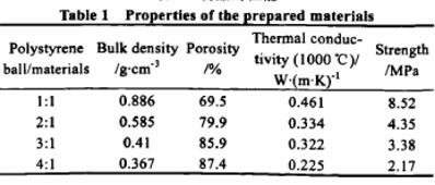 材料的薄壁結(jié)構(gòu)使材料獲得較小的體積密度和較大的氣孔率,也是材料獲得較小熱導(dǎo)率的前提條件;材料內(nèi)晶粒細(xì)小,結(jié)合緊密,使材料在獲得較大氣孔率的同時獲得盡可能高的強度,對提高材料使用性能和壽命十分有益;孔壁中的封閉氣孔,有利于進一步降低材料的熱導(dǎo)率;因此,材料的這種顯微結(jié)構(gòu),使材料具有低密度、高強度、低導(dǎo)熱的優(yōu)異性能。