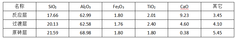 對試驗磚的反應層、過渡層、原磚層的變化進行了微現(xiàn)結構分析,包栝化學成分、巖相、電鏡、X-射線分析等。