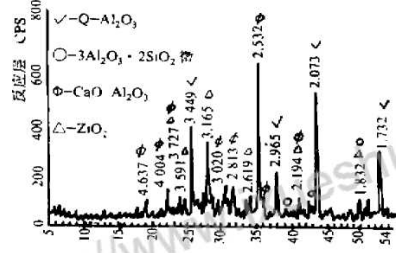 3.2 巖相分析,電鏡分析,X-射線分析如圖3-5所示,反應層變化較大,在該層發(fā)現(xiàn)了新的礦物相高熔點化合物CA6,同時發(fā)現(xiàn)β-Al2O3、α-Al2O3及極少量霞石。除了霞石對試磚產生有害影響外,前二者對水泥熟料進一步浸蝕磚面,與磚產生化學反應,強固粘結磚面均有阻礙作用。