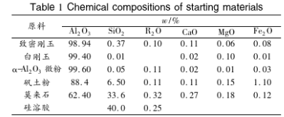 煉鋼廠所用澆注料大多數(shù)為水泥及低水泥結合高鋁澆注料。這些澆注料成型固化后一般還需養(yǎng)護2~3d,拆模后一般還需烘爐7d。為了追求高爐的高效化與長壽化,需要對爐體進行熱態(tài)修補,這是水泥、樹脂和焦油結合材料都無法滿足的,因為水泥結合材料需要足夠的水分和養(yǎng)護時間才能有良好的使用性能,而樹脂和焦油結合材料在熱態(tài)施工過程中產(chǎn)生有害氣體。為此,以硅溶膠為結合劑研制了高爐熱態(tài)修補用剛玉—莫來石快干澆注料。