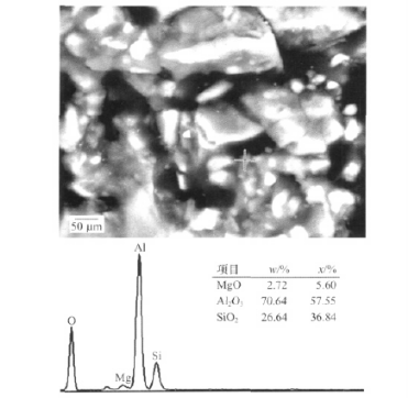 可以看出:1100 °C熱處理后,礬土水泥結合剛玉澆注料的基質(zhì)基本上沒有燒結,晶粒孤立存在,氣孔較大;而硅溶膠結合剛玉-莫來石澆注料燒結較好。對硅溶膠結合剛玉-莫來石澆注料氣孔周圍的微小晶粒作進_步觀察和能譜分析(見圖2)后發(fā)現(xiàn),它們是莫來石,表明材料在1100℃熱處理過程中形成了莫來石。