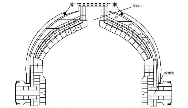 早期設(shè)計(jì)的拱頂部位爐襯分3層,分別為耐高溫沖刷性強(qiáng)的向火面磚、耐高溫沖刷性一般的背襯磚和耐火水泥。目前,已有企業(yè)將拱頂部分向火面磚與背襯磚合二為一,做成1層向火面磚,增加了向火面磚的厚度,提高了其抗沖刷的能力。
