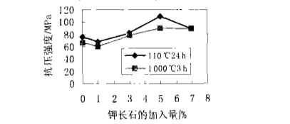 試驗中鉀長石的加入主要起到以下兩方面的作用:一是填隙減少了氣孔,當然加入量不能太多,否則因堆積密度小和不能緊密堆積而導致制品不夠致密;二是微粉分布在顆粒邊緣,因其表面活性和質(zhì)點可動性,鉀長石能在較低的溫度下雨顆粒結(jié)合得較好,封閉部分貫通氣孔,從而使制品致密化、強度增強、促進燒結(jié)。