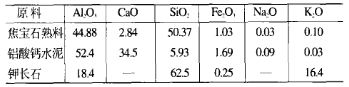 以山西的焦寶石熟料為骨料,采用的是五級粒度級配,即8~5mm、3~1mm、1~0mm及細粉,并加入鉀長石、瓷粉等外加物,結(jié)合劑是C-50鋁酸鈣水泥,主要原料的化學組成見表1。
