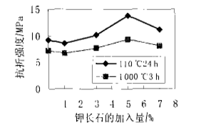 鉀長石主要是作為熔劑性礦物引入的,它可以降低制品的燒成溫度,提高制品的瓷化度,加入適量的鉀長石可以改善制品的性能。鉀長石加入后試樣抗折強度和抗折強度的變化情況見圖1和圖2。