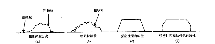 當(dāng)顆粒組成處于1區(qū)時(shí),會(huì)出現(xiàn)粗細(xì)顆粒偏析現(xiàn)象,見(jiàn)圖3(a)。當(dāng)處于2區(qū)時(shí),會(huì)出現(xiàn)粗顆粒潰散現(xiàn)象見(jiàn)圖3(b)。當(dāng)處于3區(qū)和4區(qū)時(shí)會(huì)出現(xiàn)強(qiáng)塑性狀態(tài)見(jiàn)圖3(c)、(d)。只有處于5區(qū)時(shí)才具有自流性能。
