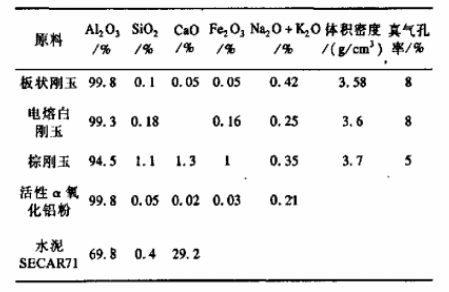 試驗(yàn)所用的原料主要有板狀剛玉、電熔白剛玉、棕剛玉、活性α氧化鋁,純鋁酸鈣水泥SE-CAR71,外加劑等。主要原料的化學(xué)成分見(jiàn)表1。