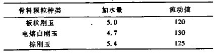 當(dāng)采用不同的顆粒骨料,固定基質(zhì)細(xì)粉的配比,所配制的剛玉質(zhì)自流澆注料其流動(dòng)性及加水量見(jiàn)表2。