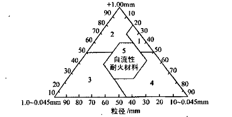 自流澆注料是根據(jù)流變學(xué)原理開(kāi)發(fā)而成的。是一種屈服值較低,并具有一定塑性粘度的粘塑性材料。因此它要求具有合適的粒度組成,骨料與基質(zhì)的比例要適當(dāng)。如圖2所示。