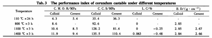 按上面相同的質量比分別采用溶膠和水泥結合攪拌均勻的材料,放入尺寸分別為40mm×40mm×160mm和70mm×70mm×70mm常溫模具內澆注成型,自然固化后脫模,對試樣進行110℃×24h的干燥,然后將該試樣于高溫成型的試樣一起分別進行815、1100和1400℃保溫3h的熱處理。其理化指標見表3。
