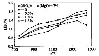 將電熔剛玉、氧化鎂、硅微粉和鋁酸鹽水泥按表2所示的配比稱量,加水7%~8%,混勻,并澆注成尺寸為Φ10mm×50mm的試樣,將成形后的試樣置于120℃下烘烤12h后,利用GP-3型高溫膨脹儀測定其在750~1450℃燒成過程中的線膨脹率LER。