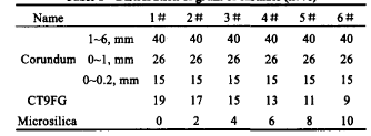 實驗中所用原料為:板狀氧化鋁、硅微粉、高鋁水泥。這里通過硅微粉加入量的變化來反應顆粒尺寸分布的變化。澆注料的配料如表1所示。