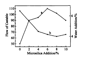 圖7 硅微粉加入量與澆注料流動性(a)及加水量(b)的關系