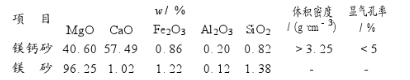 澆注料所用鎂鈣砂原料,經(jīng)處理后的理化性能見表1。