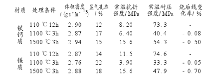2.2 鎂鈣質(zhì)澆注料的常溫物理性能