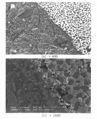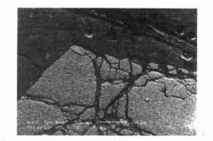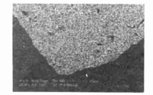 對于1500℃3h燒后的澆注料試樣,由于基質(zhì)的燒結(jié)收縮以及晶粒的發(fā)育生長,從圖5可以看出鎂鈣砂改性層分解層進(jìn)一步擴(kuò)寬,大約有40~50um,層內(nèi)MgO和CaO由于晶粒已經(jīng)明顯發(fā)育長大,并相互連接成片,而且與鎂鈣砂和基質(zhì)都出現(xiàn)了明顯的燒結(jié)現(xiàn)象,因此澆注料強(qiáng)度相比于1100℃燒后的澆注料有了很大的提高。觀察1500℃燒后試樣斷口,澆注料試樣中鎂鈣砂骨料大部分都是穿晶斷裂,說明骨料與基質(zhì)的結(jié)合程度有了很大的改善。