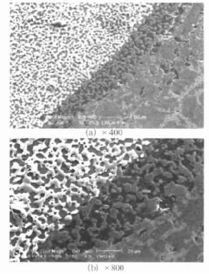 上述分析表明,澆注料在1100℃燒后鎂鈣砂表面改性層基本上都已分解為CaO,使得原來MgO晶粒與CaCO3交互形成的致密結(jié)構(gòu)發(fā)生松動,同時分解過程中所產(chǎn)生的CO2氣體的揮發(fā)又對這種疏松結(jié)構(gòu)進(jìn)行了進(jìn)一步的破壞,從而導(dǎo)致鎂鈣砂邊緣的MgO和CaO晶粒以及與改性層接觸的MgO基質(zhì)都有一定程度的松動,而從原有結(jié)構(gòu)中脫落,導(dǎo)致鎂鈣砂改性層分解后所殘留的區(qū)域比未分解前變寬。另外,燒結(jié)過程中基質(zhì)的微量收縮也導(dǎo)致了改性分解殘留層的進(jìn)一步加寬。從1100℃燒后試樣的斷口中也可以看出,大部分鎂鈣砂骨料都是沿晶斷裂,表明骨料與基質(zhì)未能緊密結(jié)合。但從表2可知,由于鎂質(zhì)澆注料中磷酸鹽結(jié)合相發(fā)生分解,而陶瓷相結(jié)合還未形成,從而導(dǎo)致澆注料中溫強(qiáng)度大幅度降低,以致其中溫強(qiáng)度比鎂鈣質(zhì)澆注料還低,說明澆注料中結(jié)合相分解所導(dǎo)致試樣強(qiáng)度的降低要遠(yuǎn)遠(yuǎn)大于鎂鈣砂改性層分解所引起試樣強(qiáng)度的下降。由此可見,雖然鎂鈣砂改性層分解造成的表面疏松結(jié)構(gòu)會降低澆注料的強(qiáng)度,但程度與結(jié)合相分解產(chǎn)生的強(qiáng)下降相比較小,不會對澆注料的使用性能造成太大的影響。