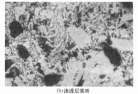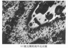 圖6為抗渣試驗后試樣的顯微結構照片。可以看出:試樣原質層與顆粒的分布比較均勻,但存在一定數量的氣孔(見圖6(a)黑色部分),爐渣正是通過這些氣孔不斷向澆注料的內部滲透的;由于爐渣中存在大量CaO、Fe2O3等低熔物,這些低熔物滲透進入試樣后與基質中的α—Al2O3反應形成鐵鋁酸四鈣及鋁酸鈣等低熔點相,如圖6(b)和圖6(c)所示:隨著反應的進行,這種低熔點相不斷向爐渣中熔出,導致試樣的蝕變層主要以針狀的鋁酸鹽為主,如圖6(b)所示。若能提高澆注料的致密度,減少其結構缺陷,則能有效地提高澆注料的抗渣性能。