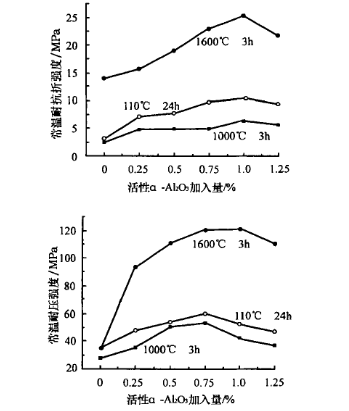 圖4示出了活性α—Al2O3加入量對不同溫度處理后澆注料強度的影響