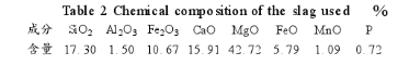 將不同粒級的原料及分散劑按設計的比例放入攪拌鍋內干攪拌30s,再加入適量水攪拌2~3min。將攪拌好的料置于振動流動度測量儀中測定其流動值。然后將試樣制成40mm×40mm×160mm的條形樣,用于測定試樣經110℃4h、1000℃3h、1600℃3h熱處理后的強度。抗渣試驗采用靜態坩堝法,試樣為70.7mm×70.7mm×70.7mm的立方法,坩堝內孔為32mm×40mm,自然養護24h后脫模,再在烘箱內于110℃干燥24h。在干燥后的抗渣試樣中加入70g爐渣(組成見表2),于1600℃3h條件下進行抗渣試驗,冷卻后用切割機沿坩堝軸線將其切開,分析坩堝試樣侵蝕和滲透的程度,并進行巖相分析。
