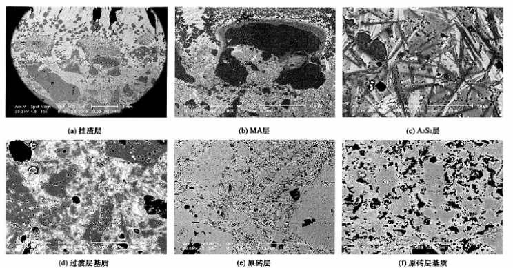 (a) MA層。如圖1(b)所示,厚度約0.8mm。該層中的剛玉顆粒被嚴重侵蝕,并在顆粒邊緣生成了一層MA;顆粒內部的Al203則反應生成大量的MA顆粒,這些顆粒分布于C2AS、CAS2等鈣鋁硅酸鹽低熔點相間;|已與渣中成分完全反應,生成了大量的鈣鋁硅酸鹽低熔點相。