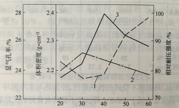 圖1-3為耐火粉料用量對不燒磚的性能的影響。從圖中可見,不燒磚的體積密度、顯氣孔率和相對耐壓強度,隨著耐火粉料用量的增加,有個最佳值。即耐火粉料用量為30%~40%時,其性能較好。耐火粉料太多時,易成型,但燒后收縮增大,粉料太少時,難成型,這包裹不住耐火骨料,體積密度小,顯氣孔率大,強度也低。在耐火粉料中摻加少量軟質黏土,可增加泥料的黏性,便于成型,高溫時則成為燒結劑,有利于高溫性能的提高。